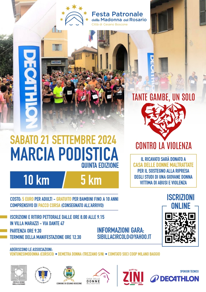 Il Liceo Vico partecipa anche quest’anno alla marcia podistica “Tante gambe, un solo cuore contro la violenza” che si terrà il 21 settembre a Cesano Boscone (partenza alle ore 9:30 da Villa Marazzi, via Dante 47). La quota di iscrizione è di 5 euro e i fondi raccolti saranno donati al Progetto RI-NASCITA. Le iscrizioni e le relative quote di partecipazione dovranno essere comunicate e consegnate ai docenti si scienze motorie o alla prof.ssa Caracciolo entro mercoledì 18 settembre. Vi aspettiamo numerosi!